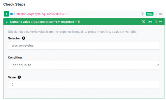 A step has been added to the API checker that compares a numeric value from the response to a value or variable. This comparison step will help to validate when a response value is greater or less than some other value, or in comparing to a constant like 0.