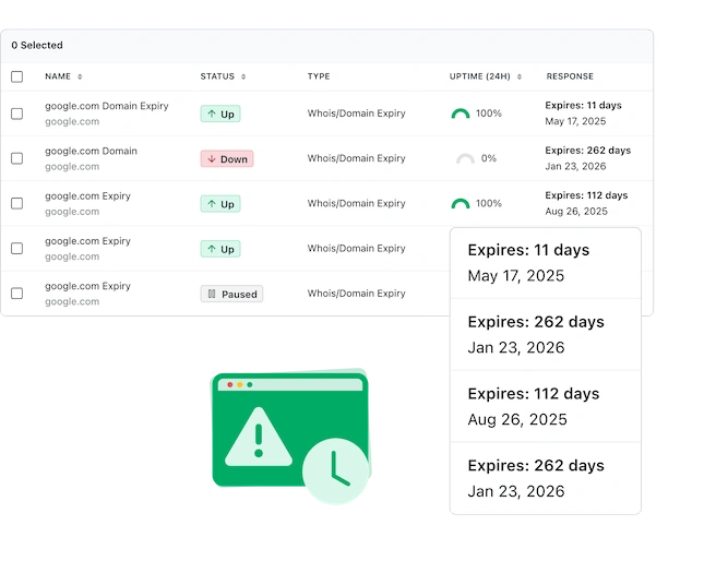 A forgotten domain renewal or unauthorized WHOIS change can result in lost traffic, security threats, and reputation damage. Uptime.com’s WHOIS/Domain Monitoring solution helps you stay on top of expiration dates, registrar updates, and ownership changes—so you never lose control. With automated alerts and seamless monitoring, you’ll always be one step ahead.